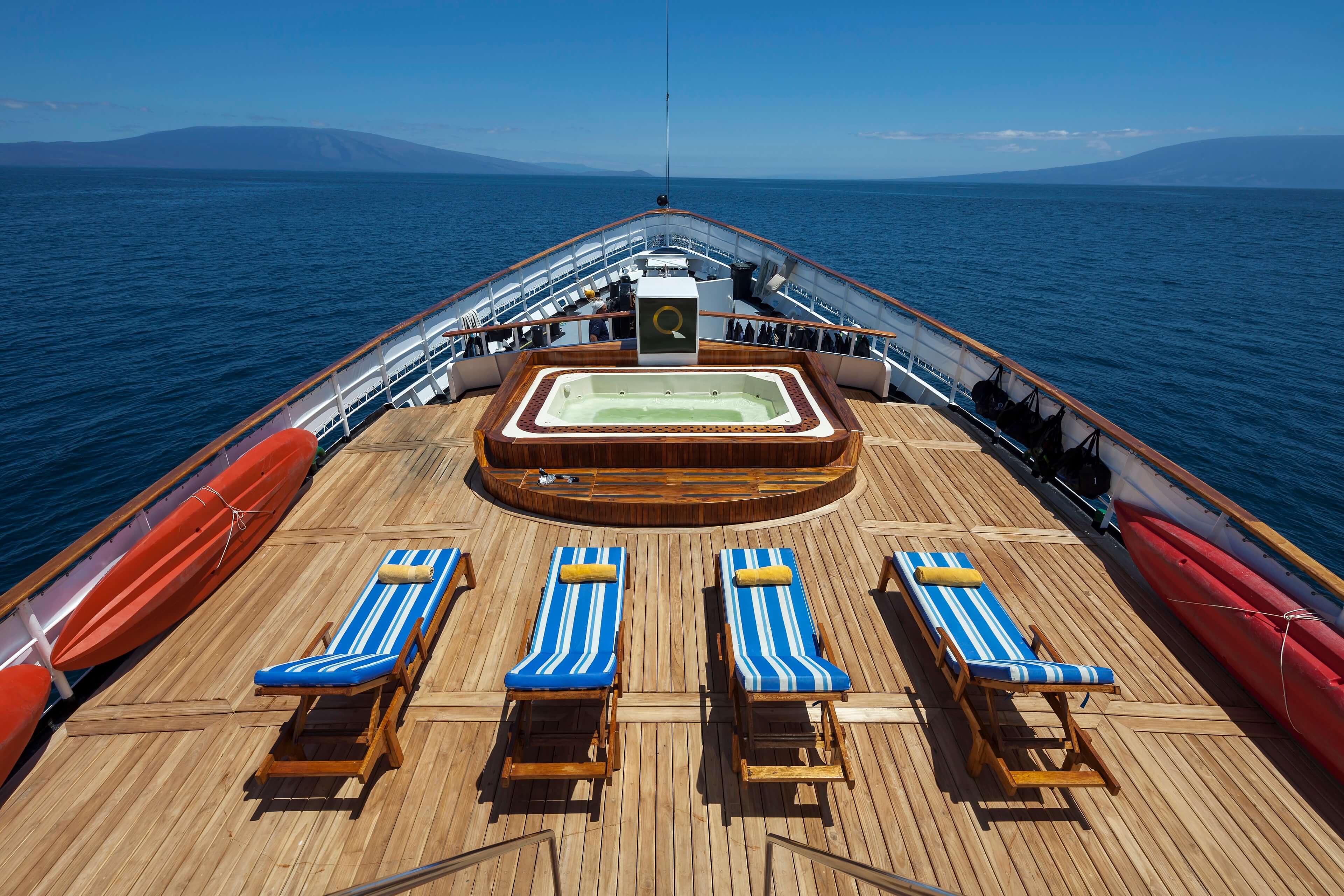 Several sun loungers are laid out on the foredeck, and a massive Jacuzzi is placed on the bow.