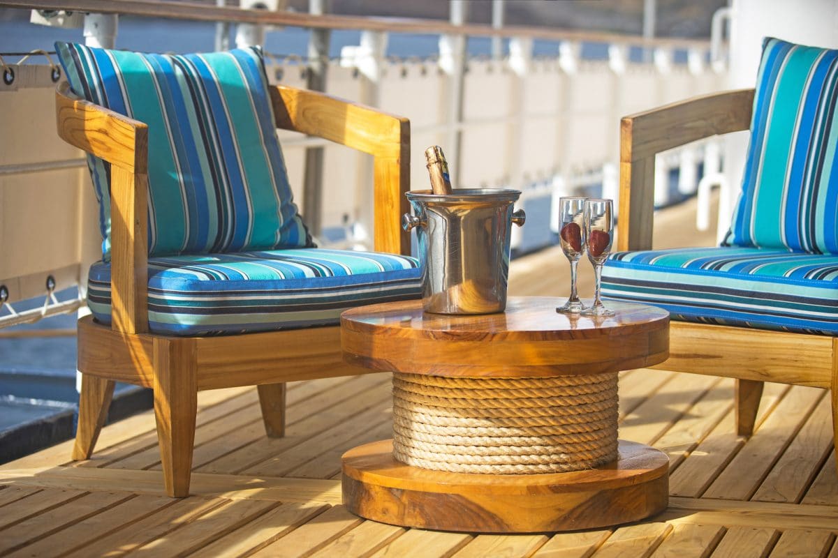 The upper deck is the hub of outdoor entertaining, and the aft section has four alfresco dining tables each surrounded by eight seats.