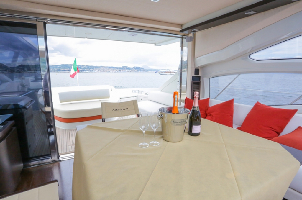 Stairways connect up to the main deck aft, where there is a plush sun-exposed sunbed that can be converted into an alfresco dining and lounging area, with a forward facing sofa to join the port curving sofa and a starboard grill, ...