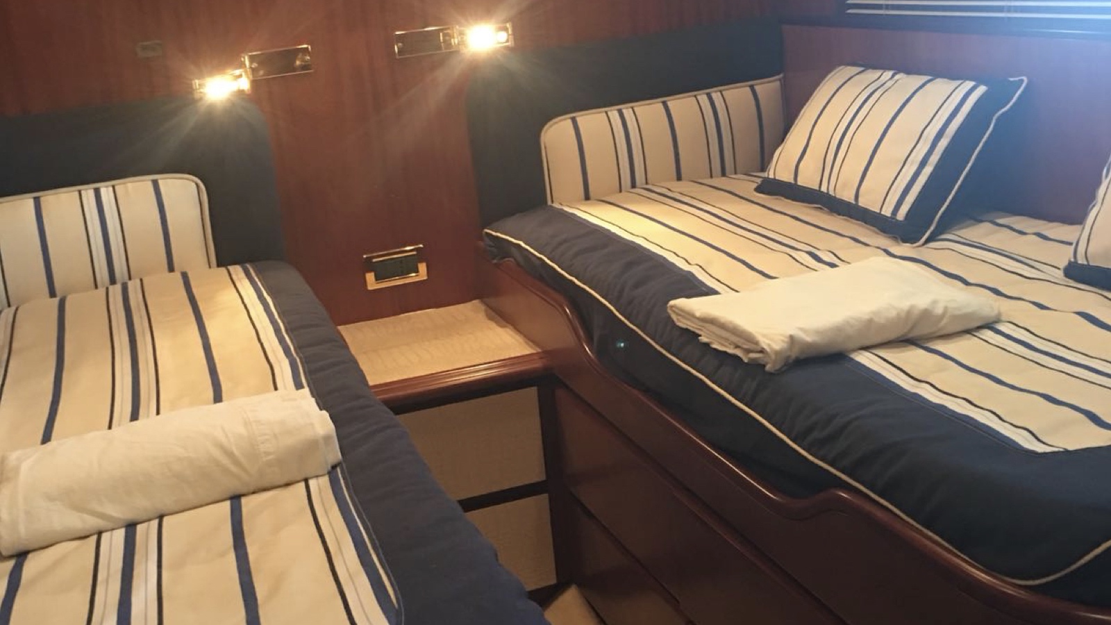 She was refitted in 2019 (new moquette) and offers accommodation in four cabins for up to 8 charter guests and further accommodation for a professional crew of 3. Her naval architecture is by Gabriele Zucconi.