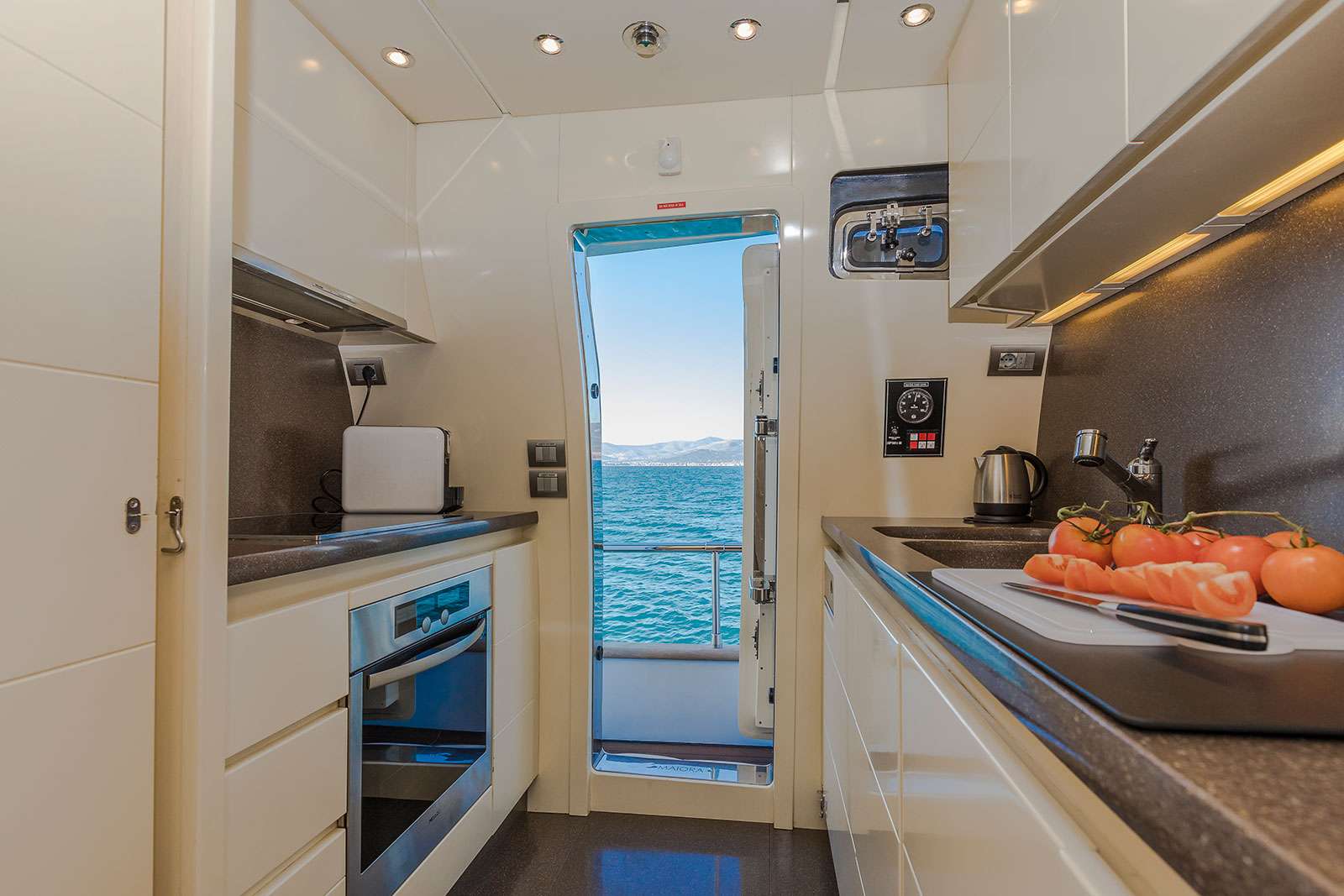 The galley is immediately behind the helm controls, and a set of steps leads down into the salon which is furnished with a large C-shaped sofa and coffee table along the port wall and to starboard cabinetry and a widescreen TV.