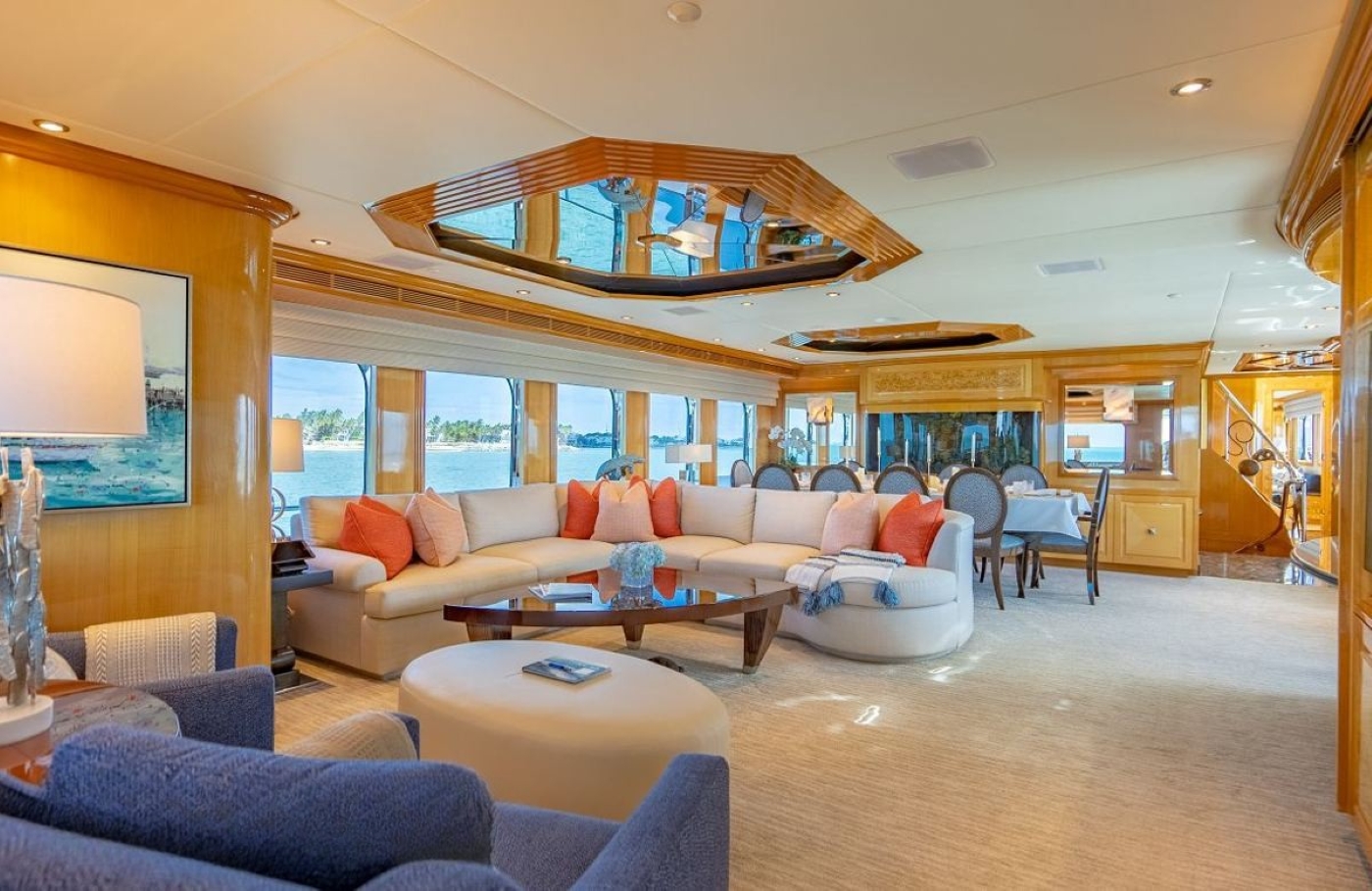 The main salon is also within this same open room and the port side of the room has an aft-facing corner sofa and coffee table along with two large armchairs and a footrest/coffee table aft and a widescreen TV mounted within the wooden panelling opposite.