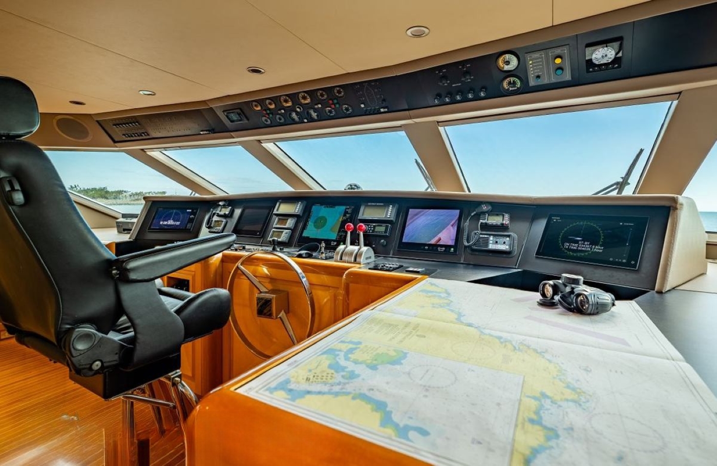 The helm controls with two co-captain chairs are forward, and guests can enjoy panoramic views while at anchor.