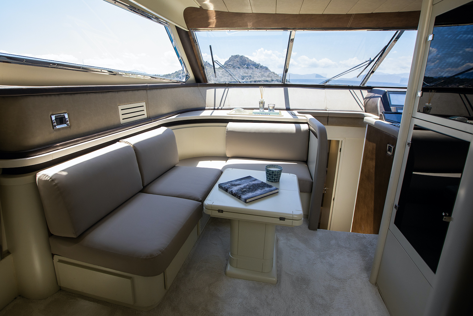 A bar with stools is placed to starboard and forward to port there is a C-shaped sofa, raised table and additional chairs in the sunshine. After a large lunch, guests can take a nap on the sunbed adjacent.