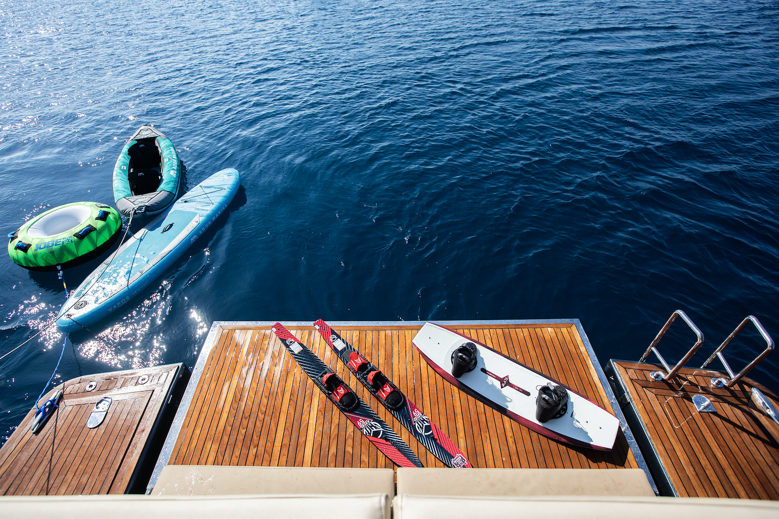 The lower deck contains the guest and crew accommodation, with storage for water toys.
