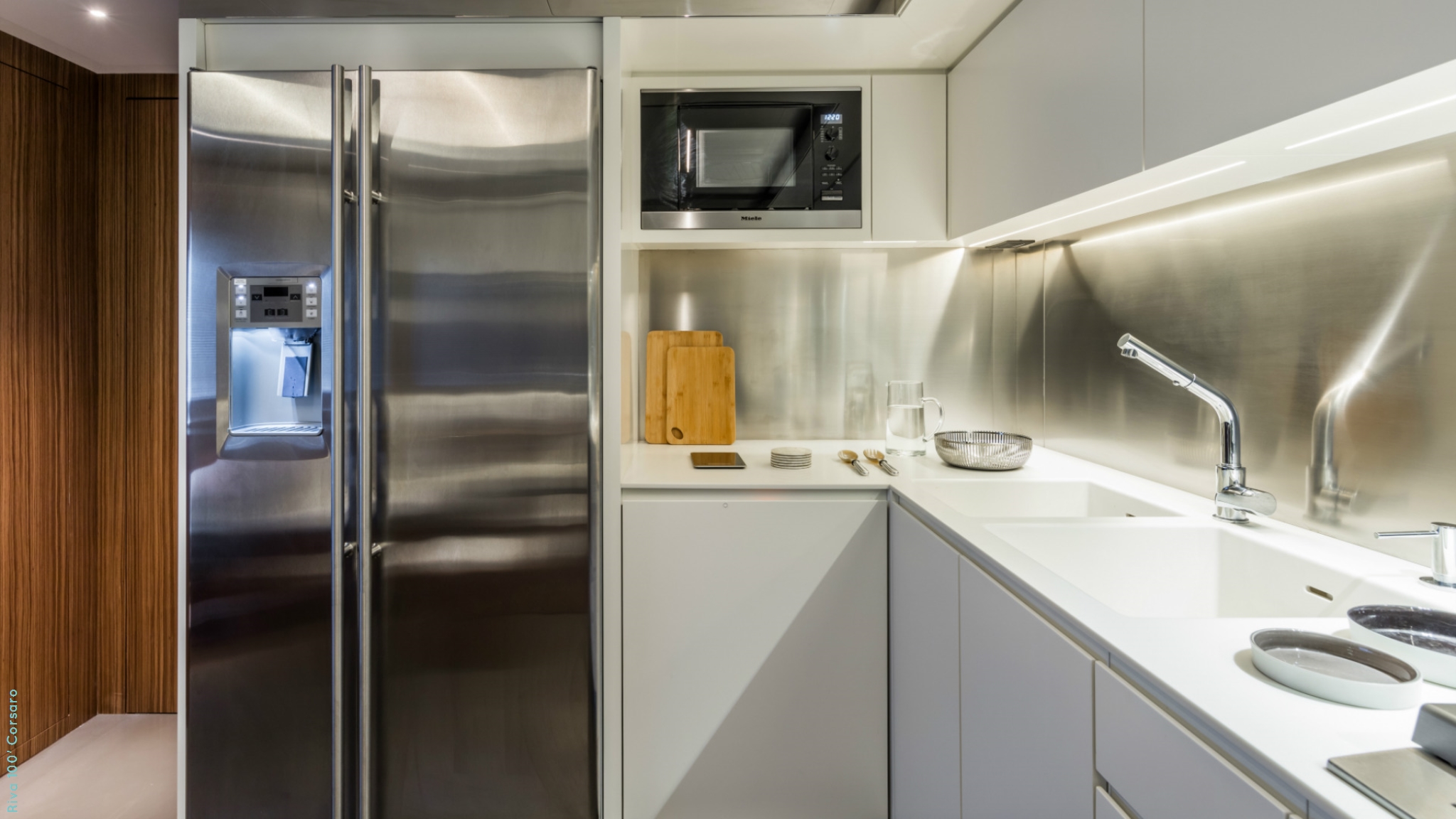 Above the main deck, the flybridge has a fantastic sunbathing area with bar and seating.