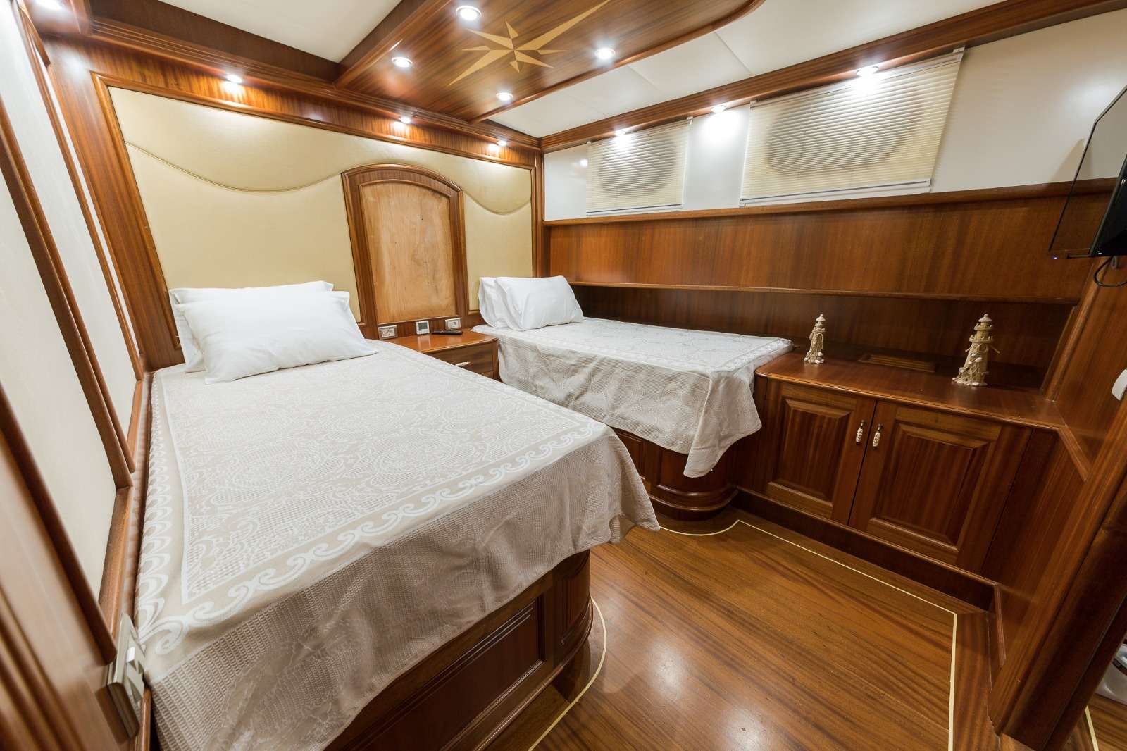 Accommodation on board is provided for up to 18 charter guests in 8 cabins. There is a crew of 6 offering professional and friendly service at all times.