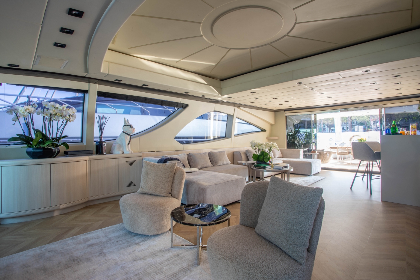 NOTABLE FEATURES OF MRS GREY: Fast hull design ~ Contemporary interior decor ~ Upper salon ideal for entertaining ~ Plenty of water toys ~ Extended swim platform ~ Wifi