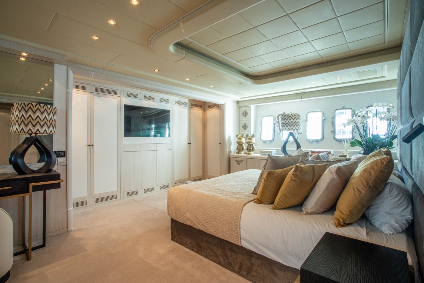Her raised salon and open plan dining is spacious, light and ideal for gathering with family and friends. The decor is a combination of rich tones and crisp whites, with the lounge aft and formal dining forward.