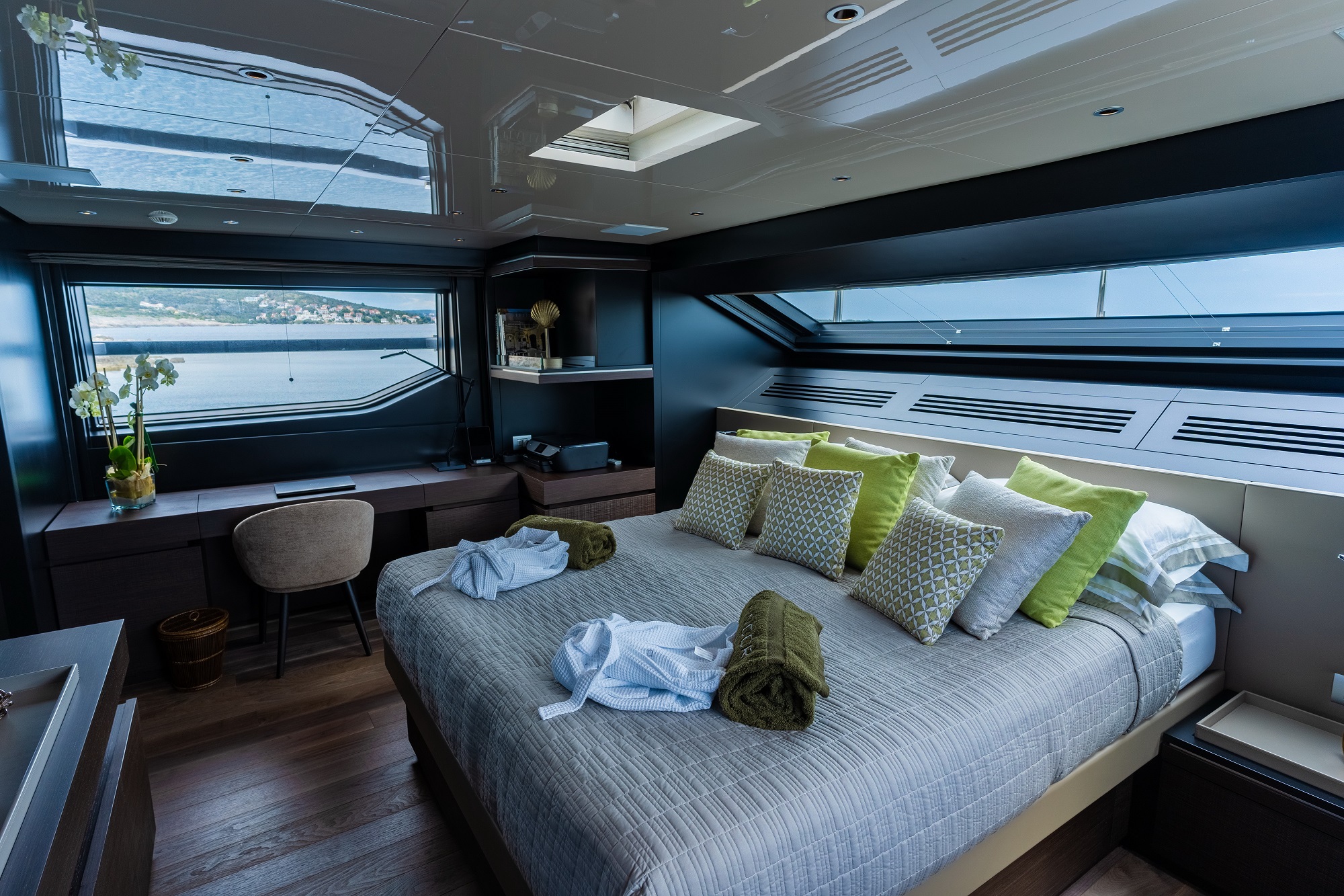 The master suite is located on the main deck with an office area as well as an ensuite bathroom. Further accommodation with modern and luxurious amenities is located on the lower deck and includes two VIP cabins and two twin ...