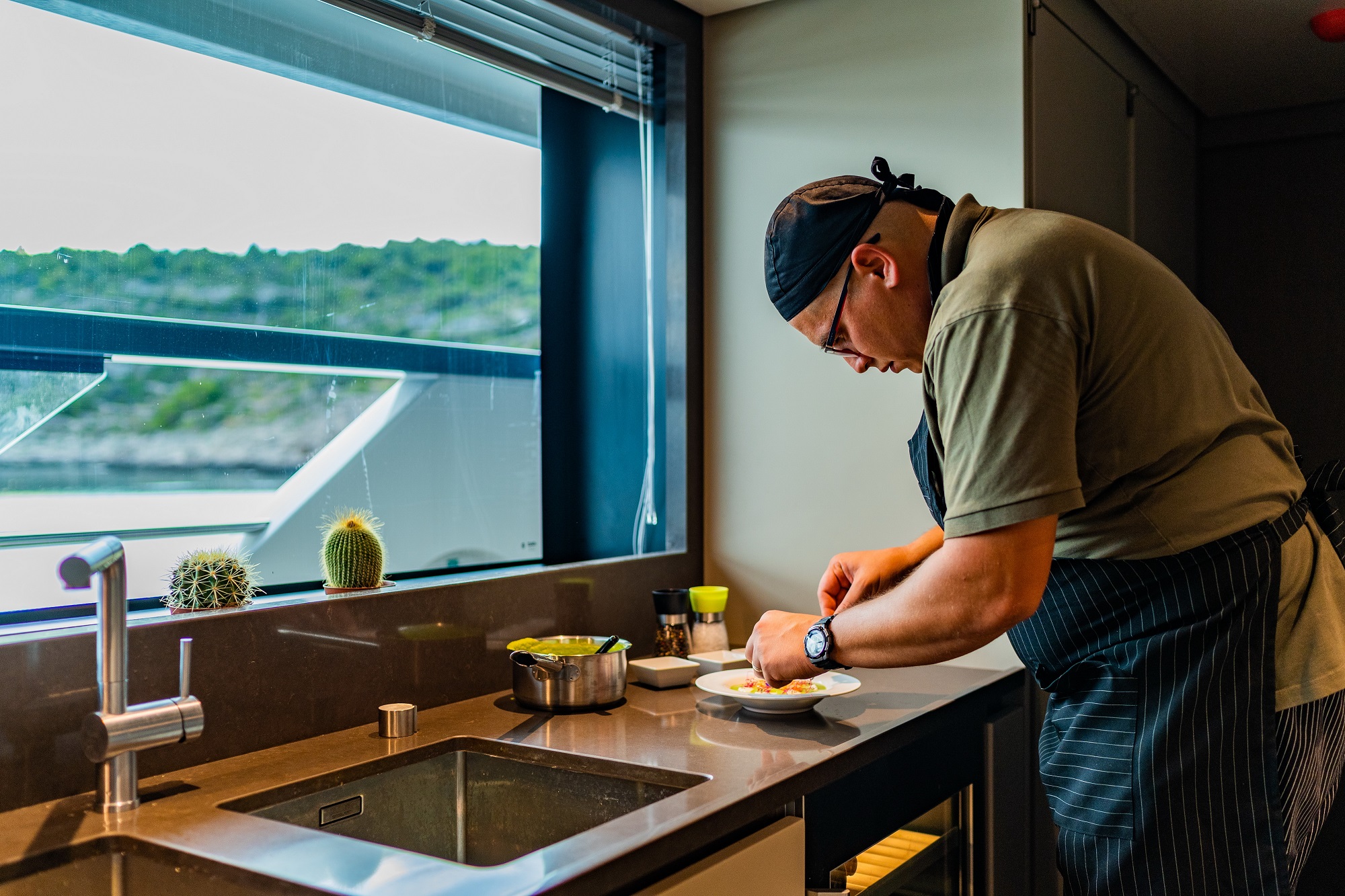 When it comes to her interior areas, the main deck is the main focal point for socialising, including two comfortable sofas and a coffee table, with an elegant dining area adjacent as well as a huge TV screen.