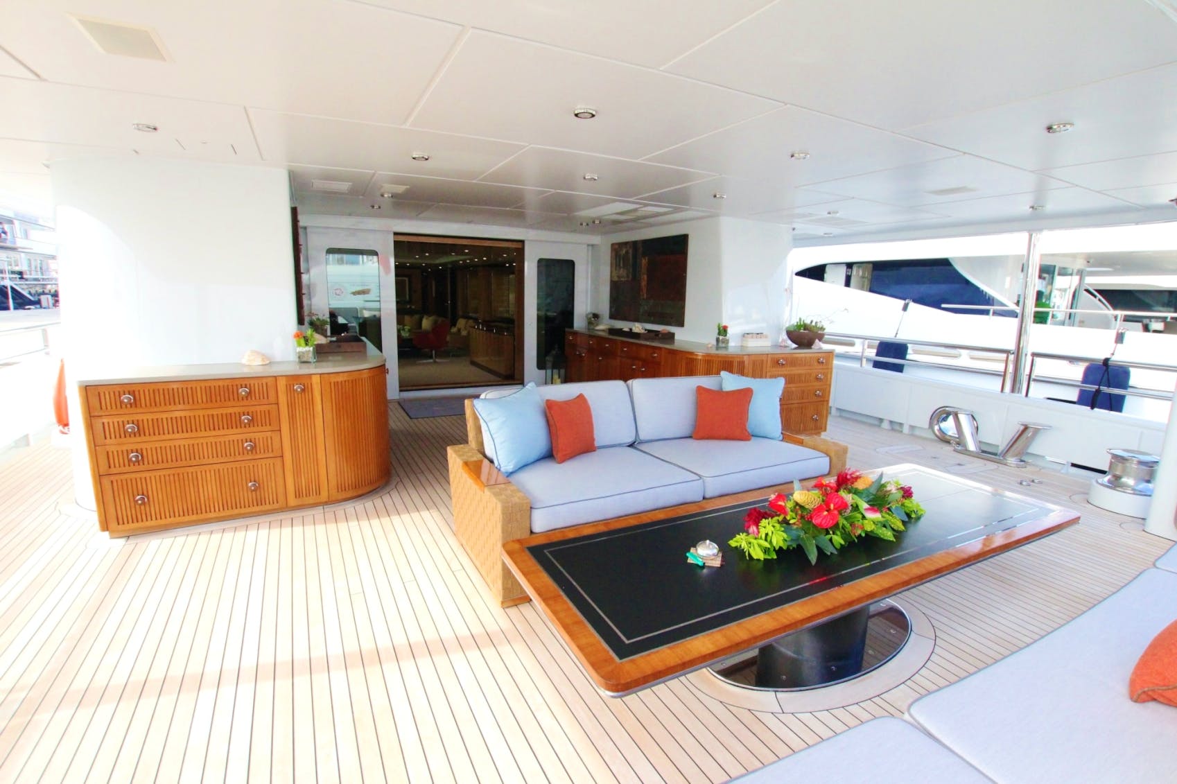 The upper deck aft is the main alfresco dining area, with a grand table close to the doors into the skylounge.