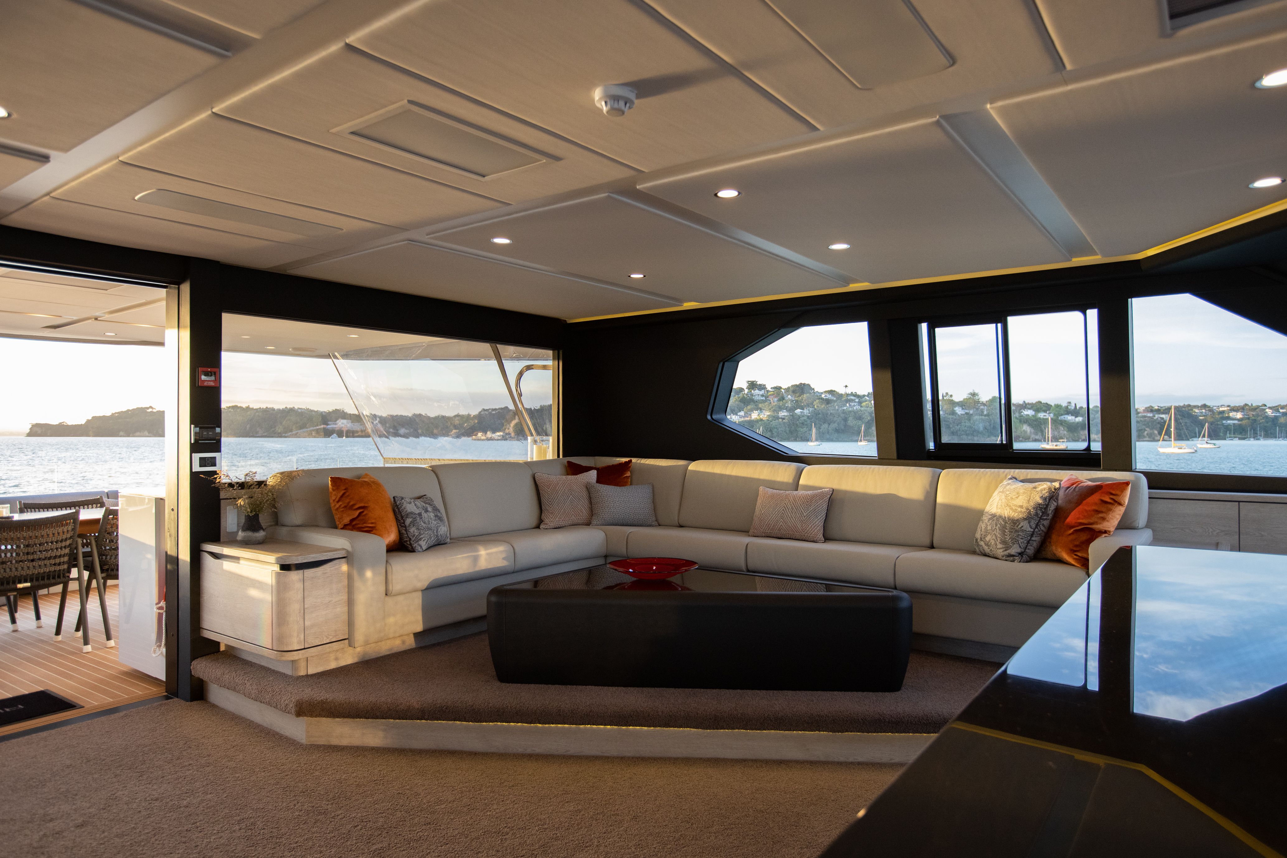 The bridge deck features the helm station and seating areas, while the exterior offers yet another alfresco dining possibility.