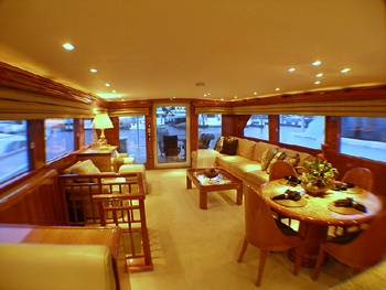 Her main saloon features a large TV, Direct Satellite Service, CD and VCR. The adjoining dinning room with seating for 6 is found on the main level of the yacht. Downstairs there is accommodation for 6 guests in 3 double cabins.