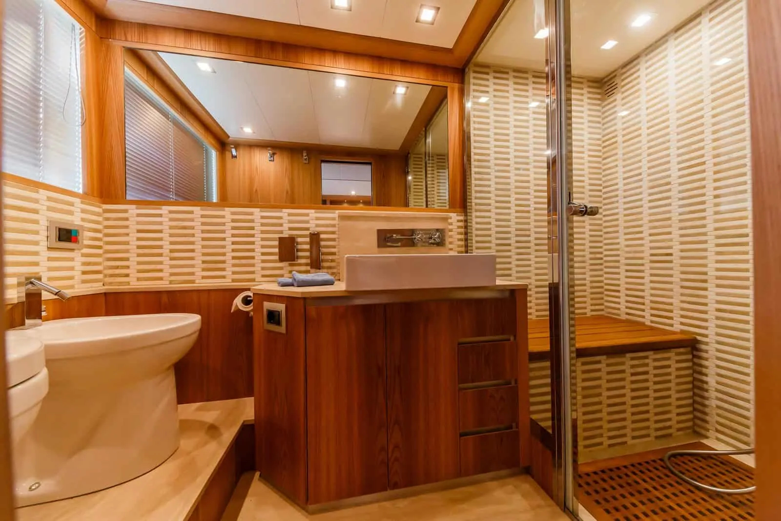 Below decks, the main master suite with an ensuite bathroom, a seating area and good storage is located, in addition to one VIP, one twin and one bunk cabin; all with ensuite bathrooms.