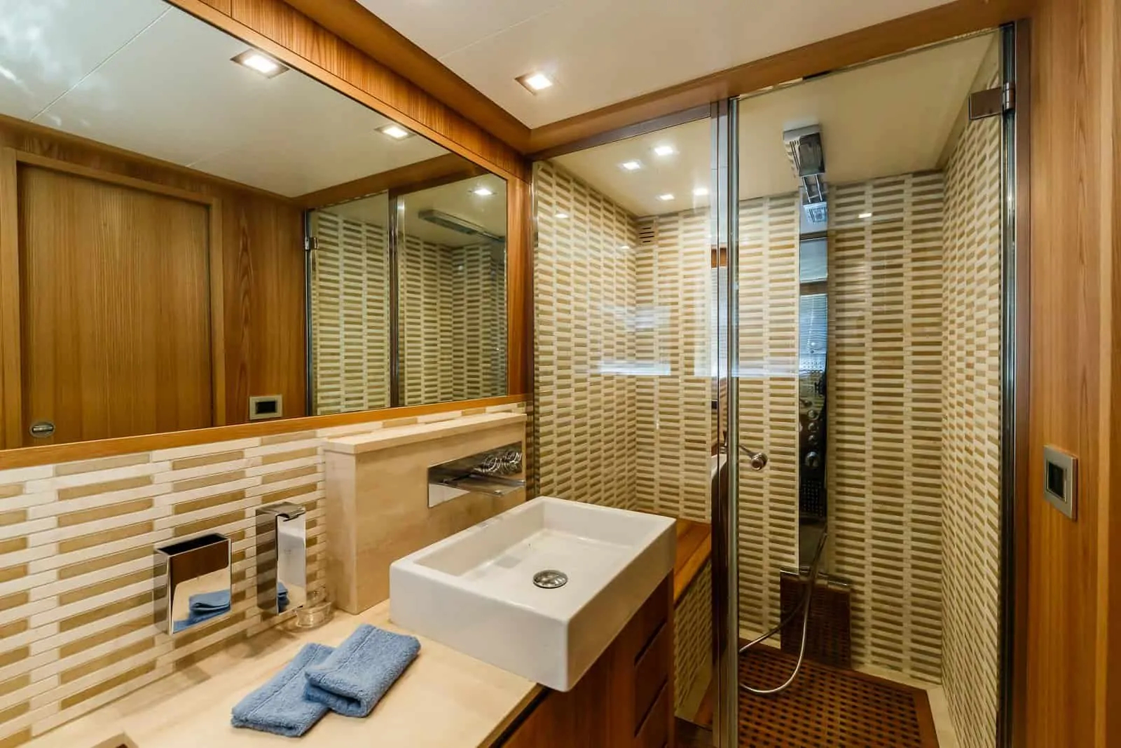 Below decks, the main master suite with an ensuite bathroom, a seating area and good storage is located, in addition to one VIP, one twin and one bunk cabin; all with ensuite bathrooms.