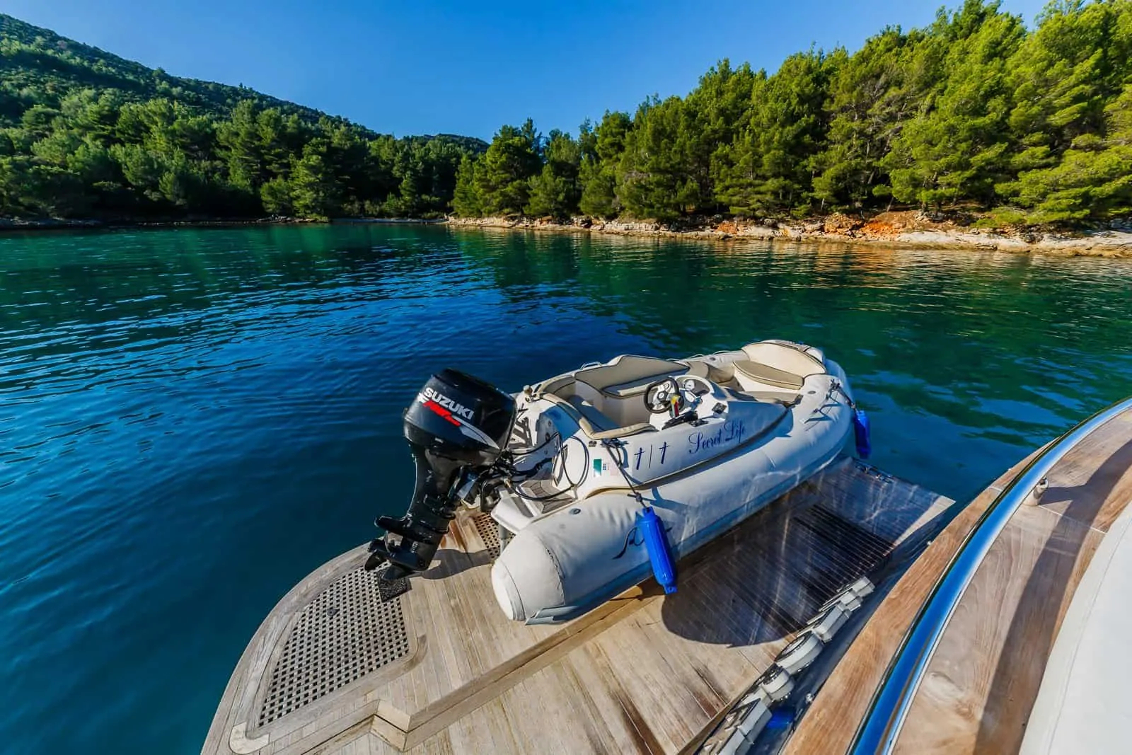 A spacious swim platform serves to store the tender and when launched, this area is fabulous for easy access to the water and sunbathing.