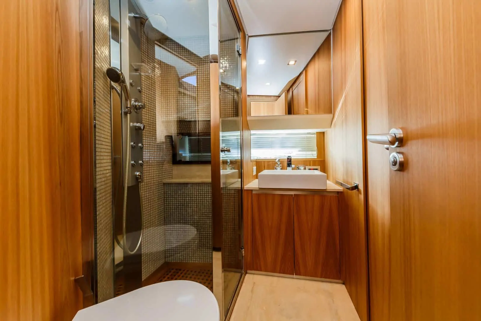 Below decks, the main master suite with an ensuite bathroom, a seating area and good storage is located, in addition to one VIP, one twin and one bunk cabin; all with ensuite bathrooms.
