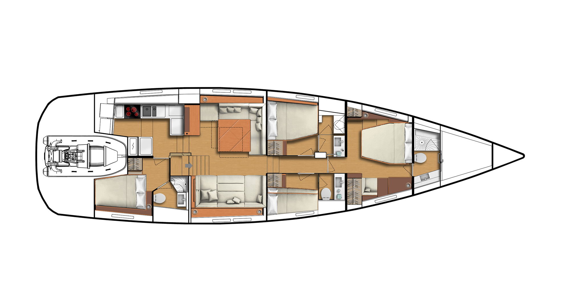 The salon has a modular table, perfect for dining, or serves as a coffee table when lowered down. The lounge area is transformable from a 3m sofa into separate seating, which can be moved to the dining table for everyone to sit down for a meal.