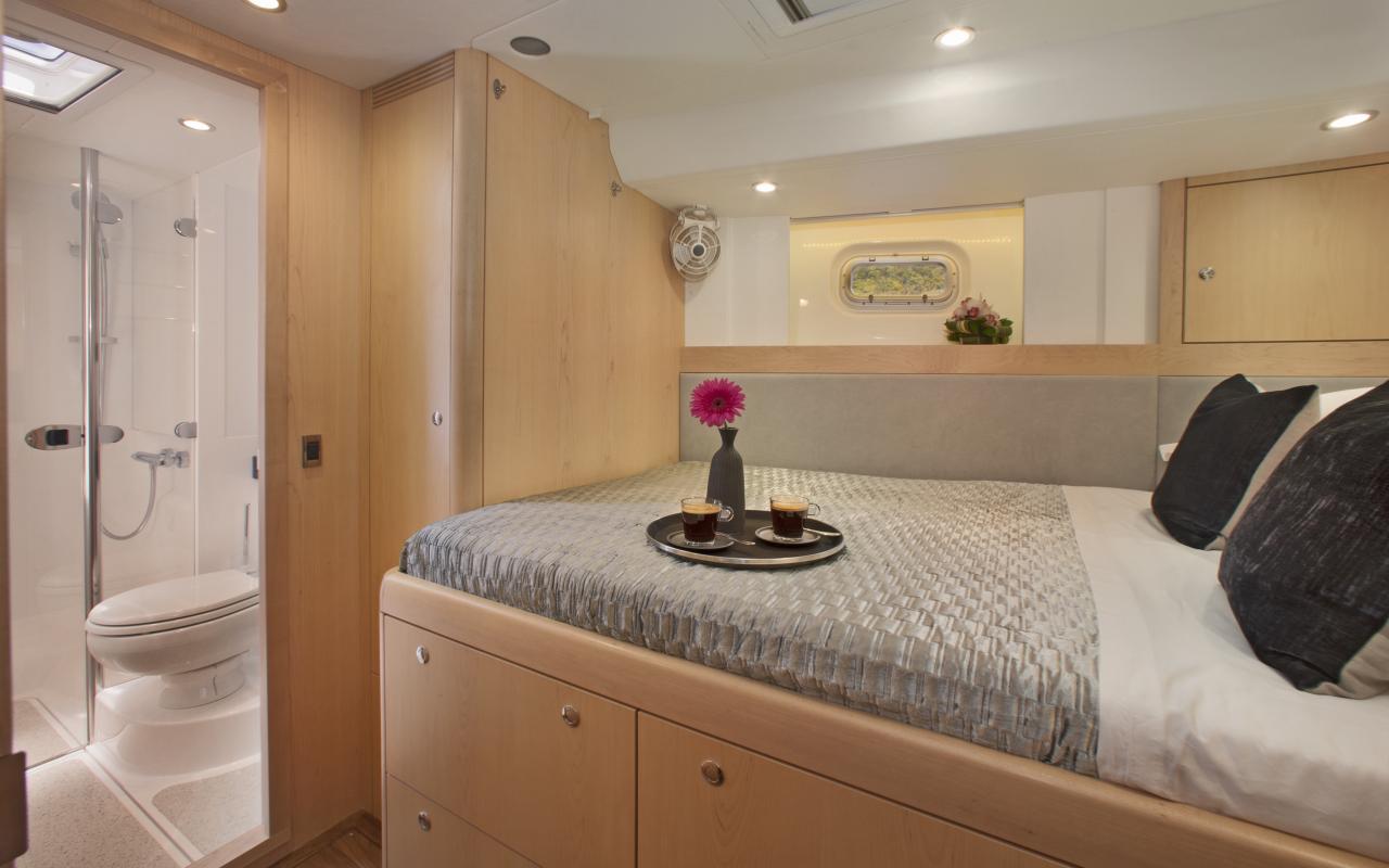 Accommodation is provided across three cabins and can sleep 4 guests or 6 on request. The master cabin is a full-beam size and is located aft of the yacht. It includes a queen-size bed, vanity, loveseat and an ensuite with shower.