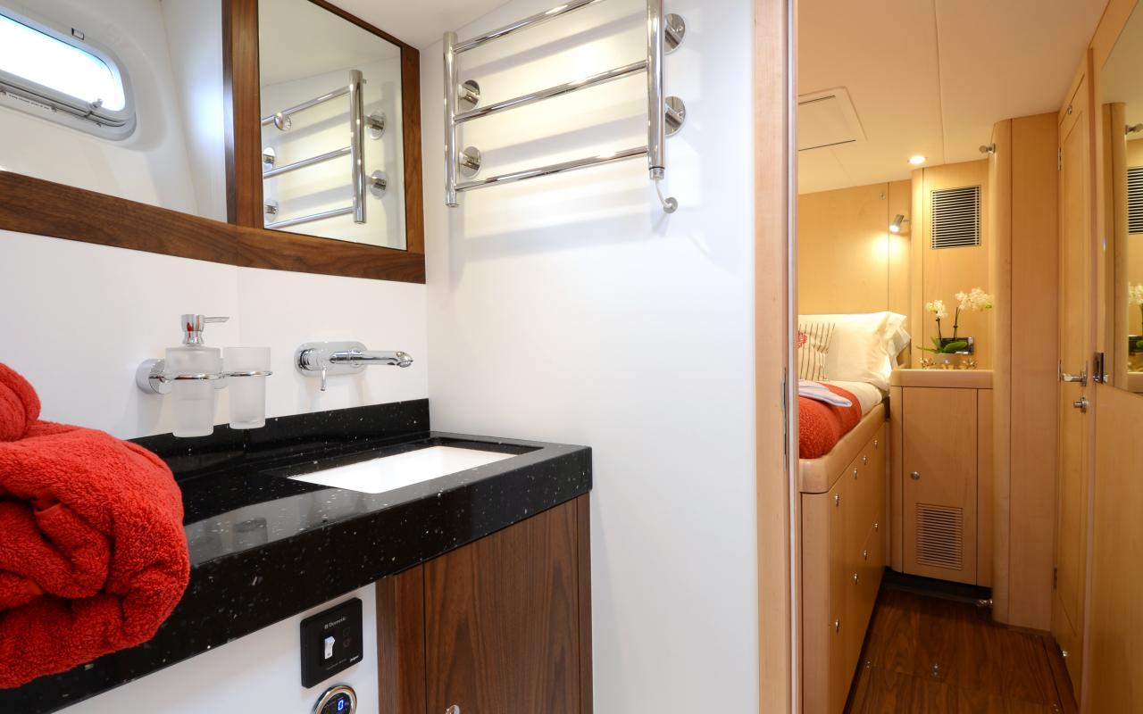 It includes a queen-size bed, vanity, loveseat and an ensuite with shower. Forward of the master suite is the double bunk cabin, ideal for children. There is an additional double cabin forward of the salon. A crew of 2 can sleep in the bunk cabin on the port side.