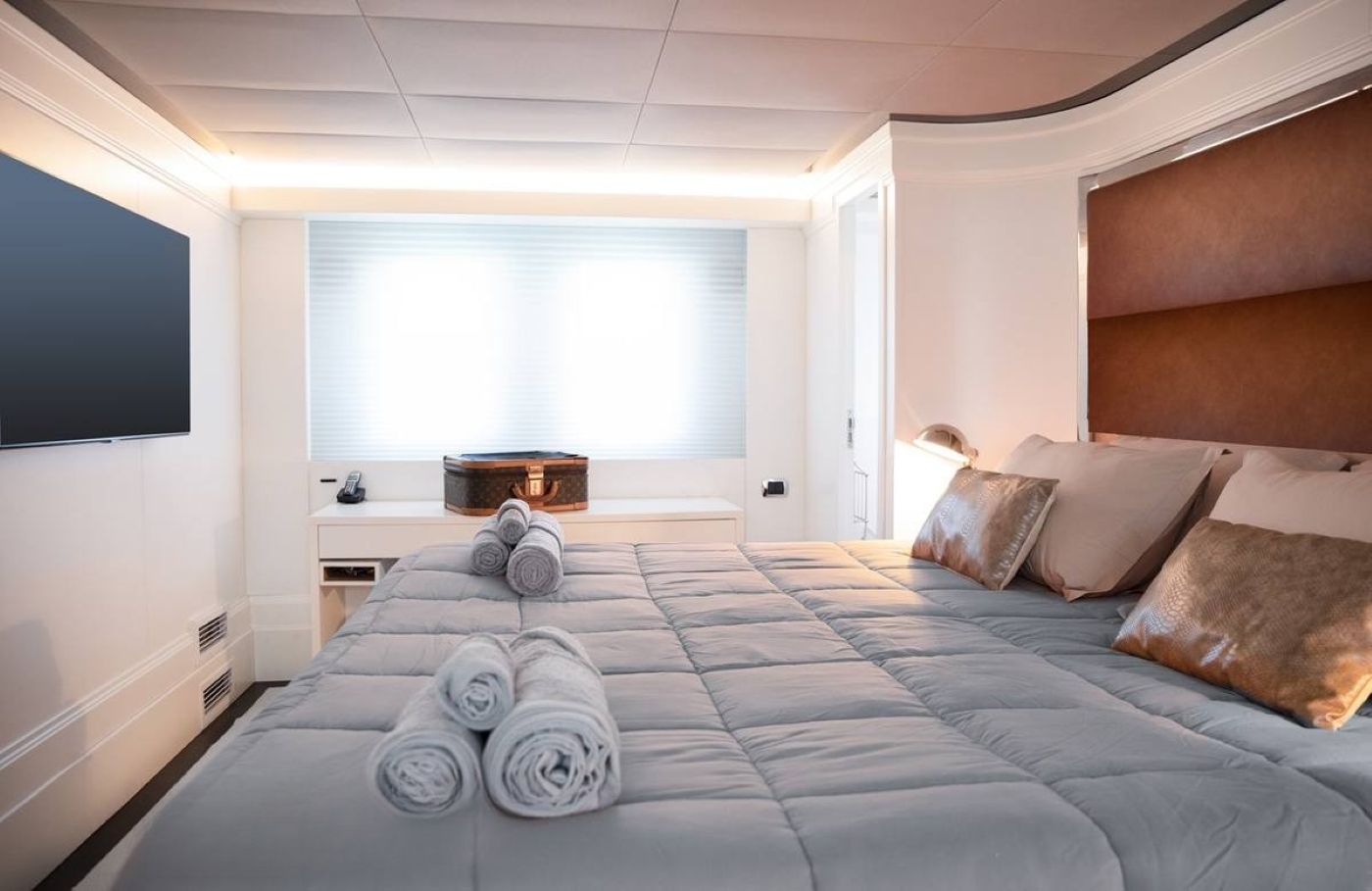 A widescreen TV is mounted on the wall and an armchair placed beneath, while the port and starboard walls both have a sofa running along and a coffee table at the centre of the room.