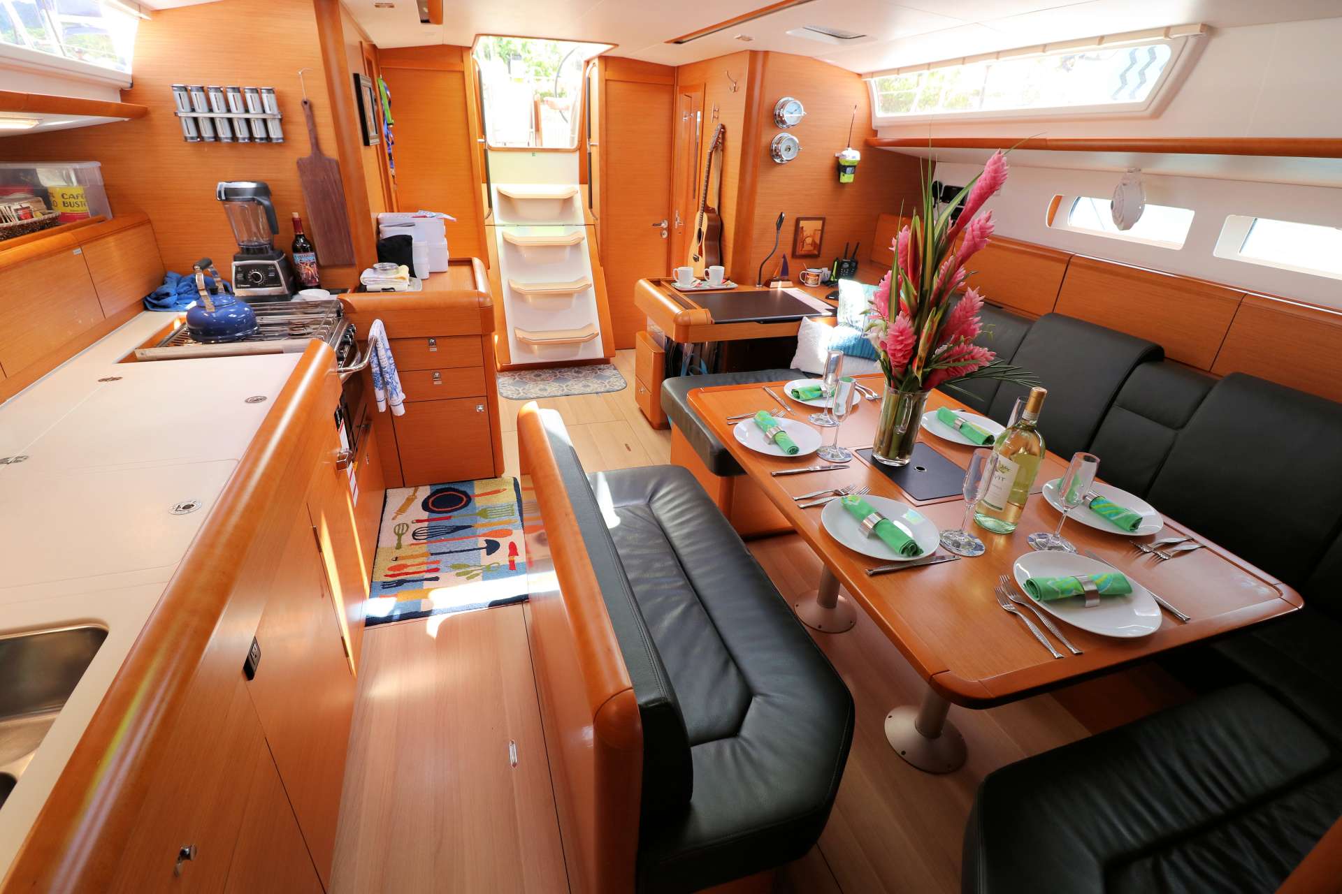 Indoors, the dining table is surrounded by comfortable seating. Guest cabins include one cabin with a queen-size bed and two cabins with double beds. All cabins are fitted with air-conditioning.