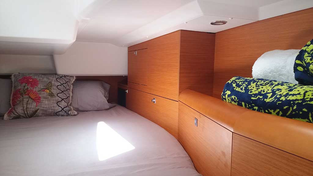 On deck, there is a vast socialising and sunbathing area fully shaded. The foldable table in the middle provides a great alfresco dining spot.