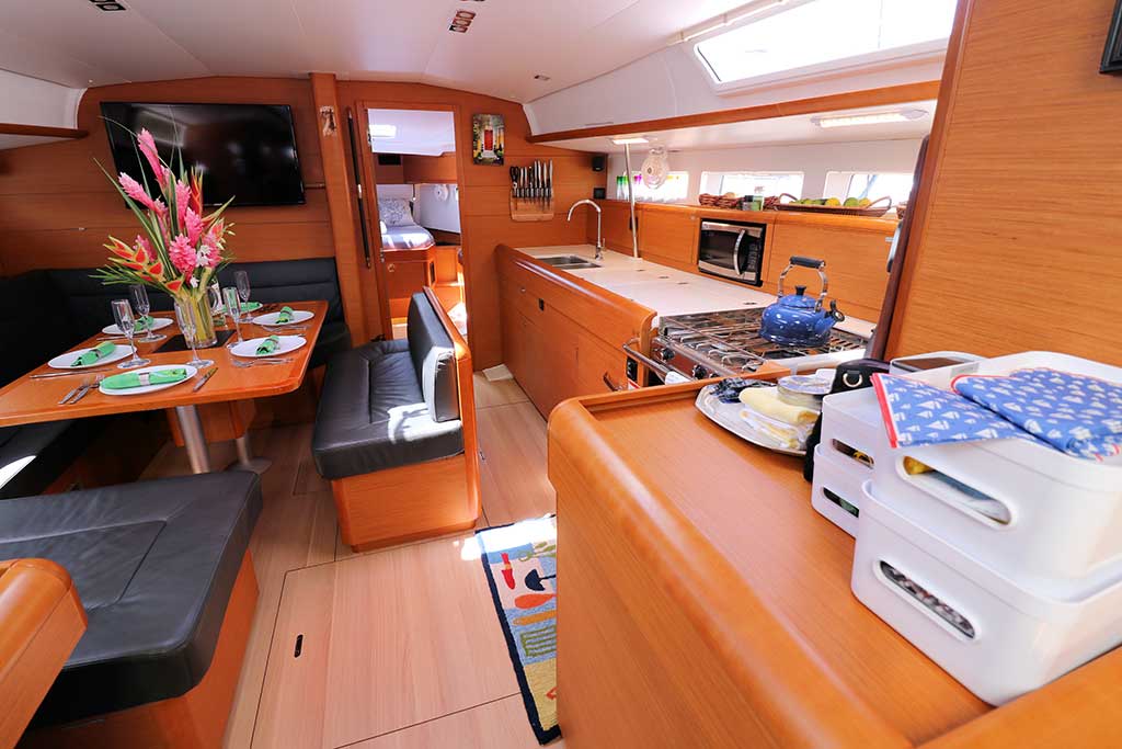 Indoors, the dining table is surrounded by comfortable seating. Guest cabins include one cabin with a queen-size bed and two cabins with double beds. All cabins are fitted with air-conditioning.