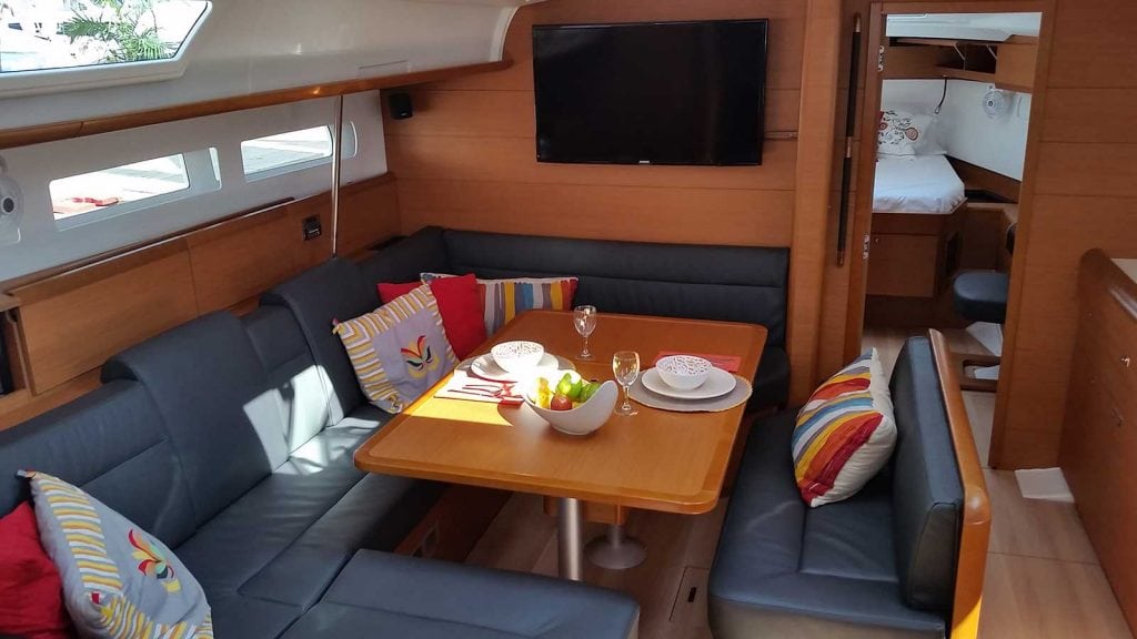 Indoors, the dining table is surrounded by comfortable seating. Guest cabins include one cabin with a queen-size bed and two cabins with double beds. All cabins are fitted with air-conditioning.