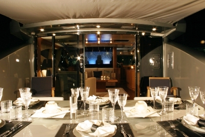 Motor yacht ORACLE STAR I is fully air-conditioned, however while relaxing in the salon, guests may enjoy a unique retractable roof, allowing for plenty of natural air flow. Most guests prefer to dine in the open air.