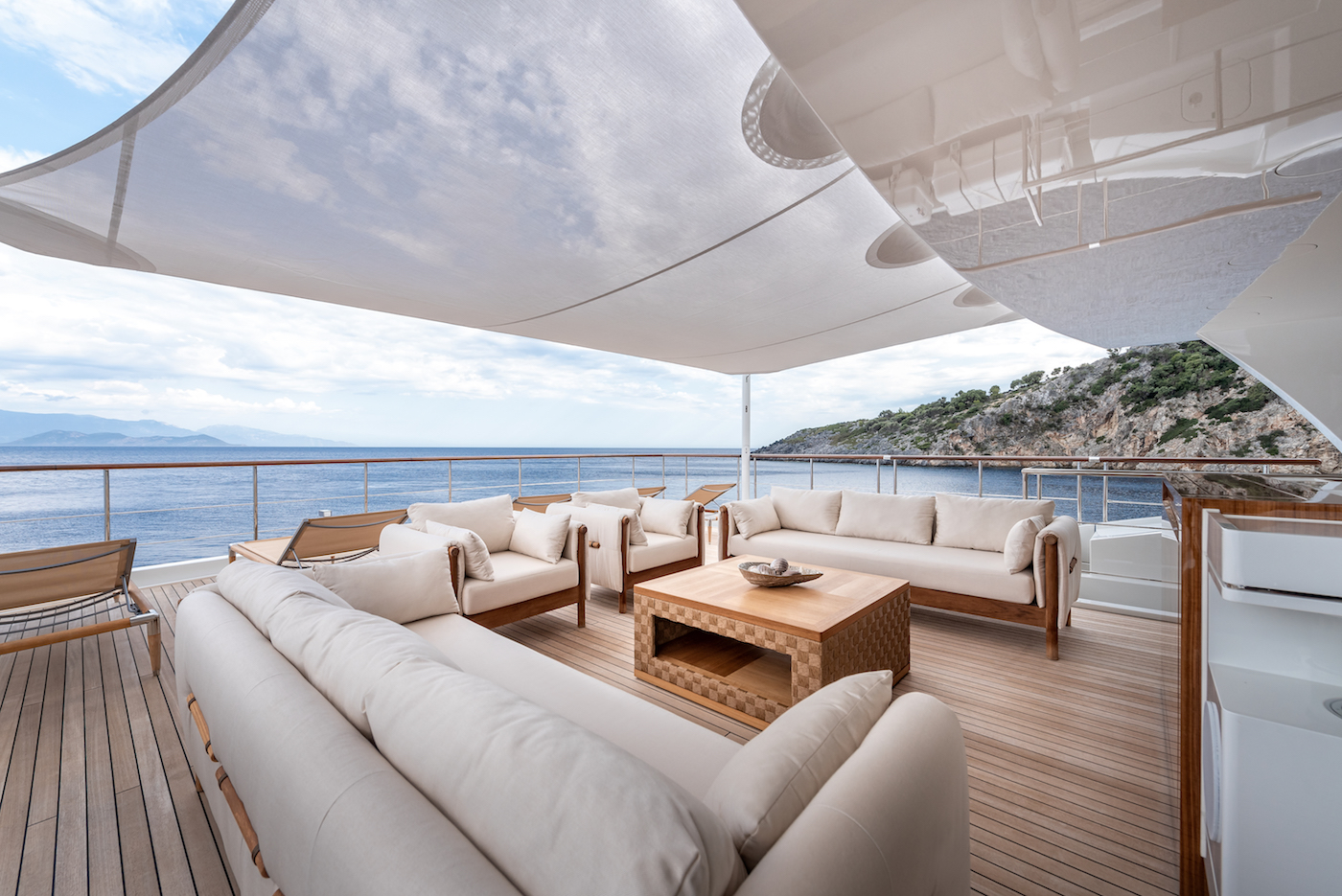Another stairway connects to the upper deck aft, which offers plenty of seating for enjoying the locality day or night. The sun-exposed foredeck is furnished with a C-shaped sofa, raised table and additional chairs for dinner and ...