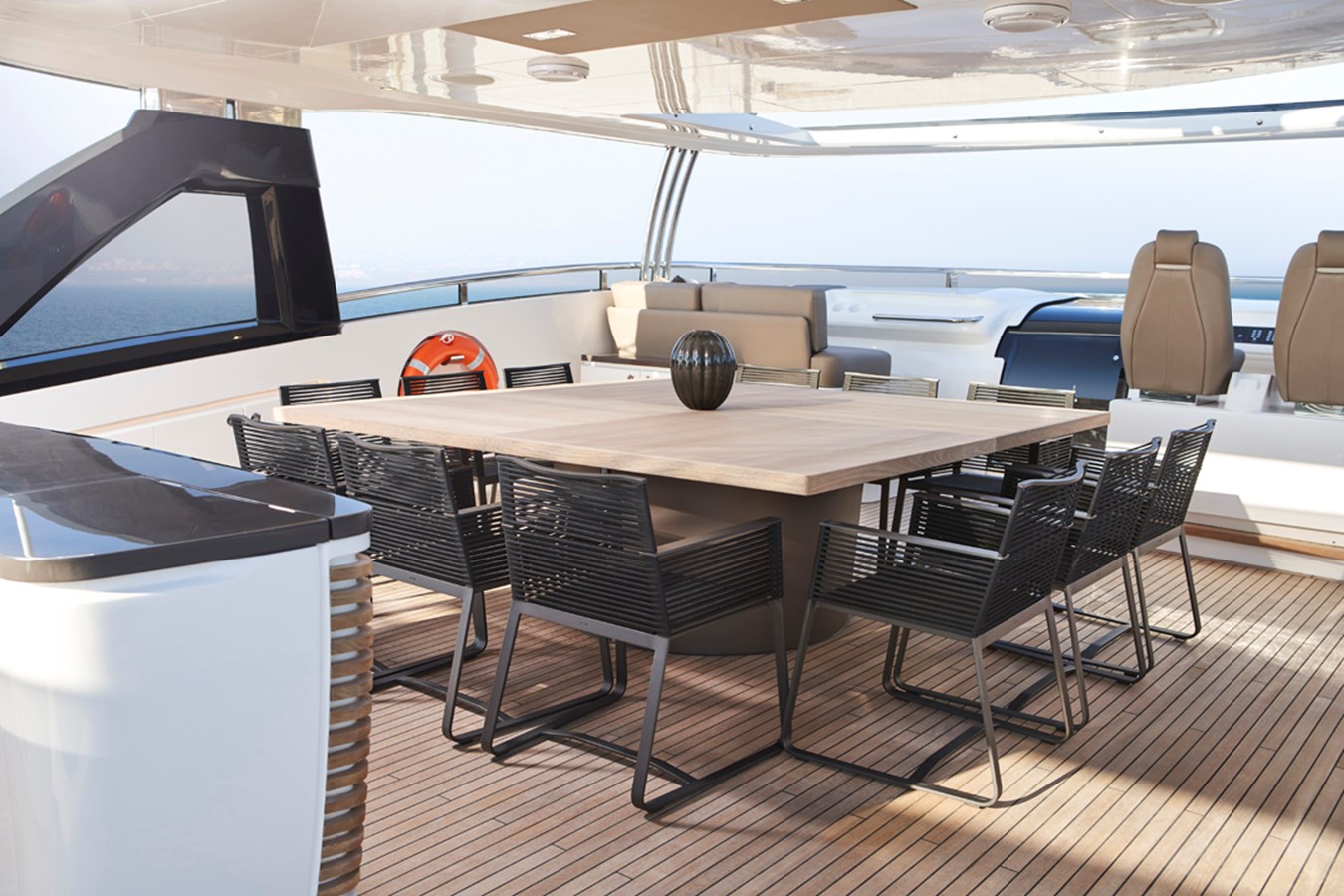 The yacht offers modern design, great performance and comfortable accommodation, sleeping up to 10 guests in 5 cabins, serviced by a crew of 5 professionals.