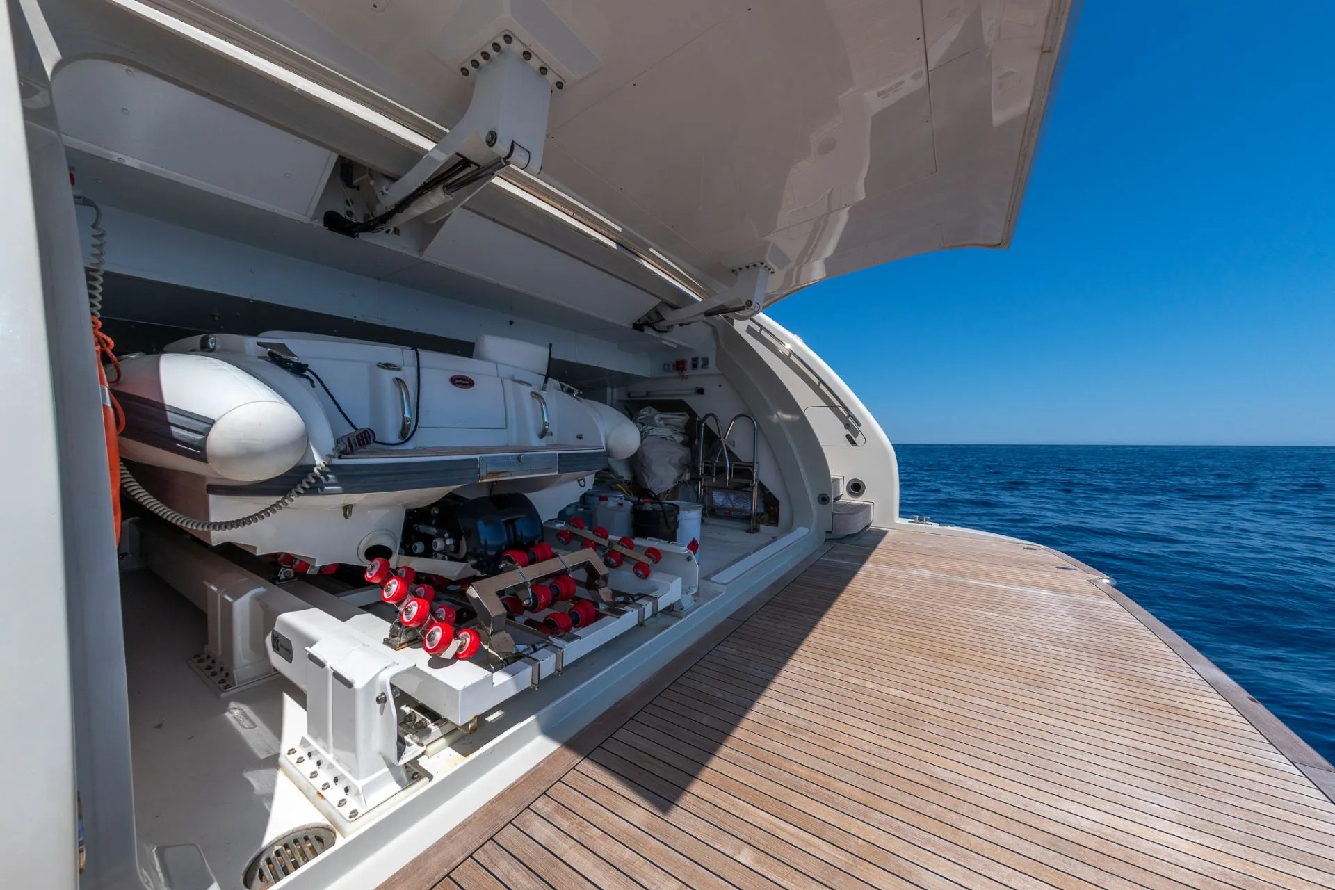 The engine room is aft and the tender garage with water toys storage in the stern.