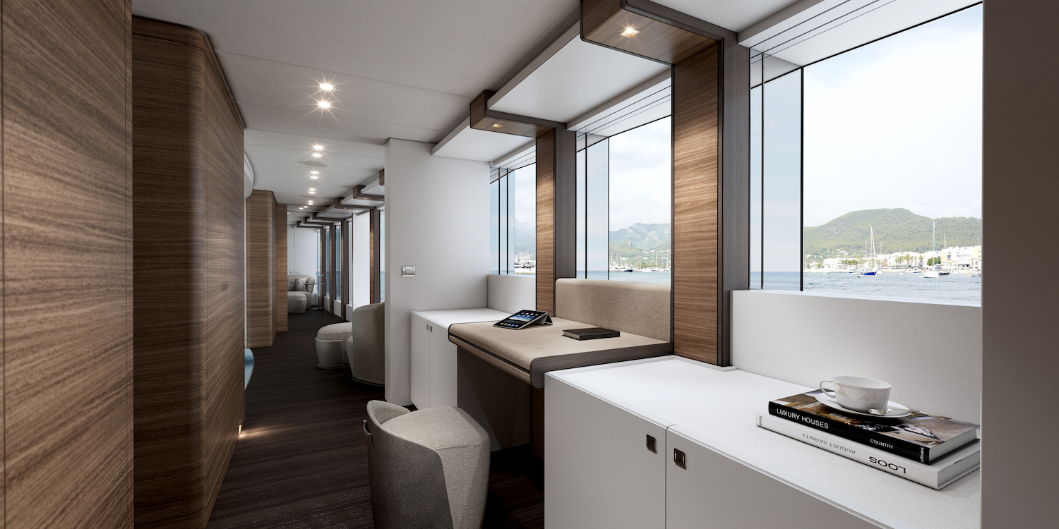 The Master suite is placed on the main deck forward, with an office connecting through to the main foyer on the starboard side. The galley is amidships to port and behind is the voluminous formal dining area combined with the main salon to create one large open space.