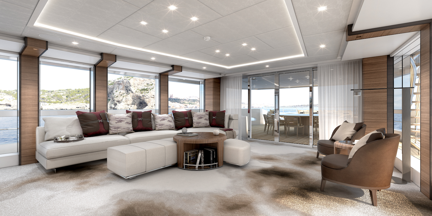 The white hull joins seamlessly with the superstructure, and dark floor-to-ceiling windows from the main deck up create areas of contrast while providing the practical benefit of plenty of light and panoramic views from the ...
