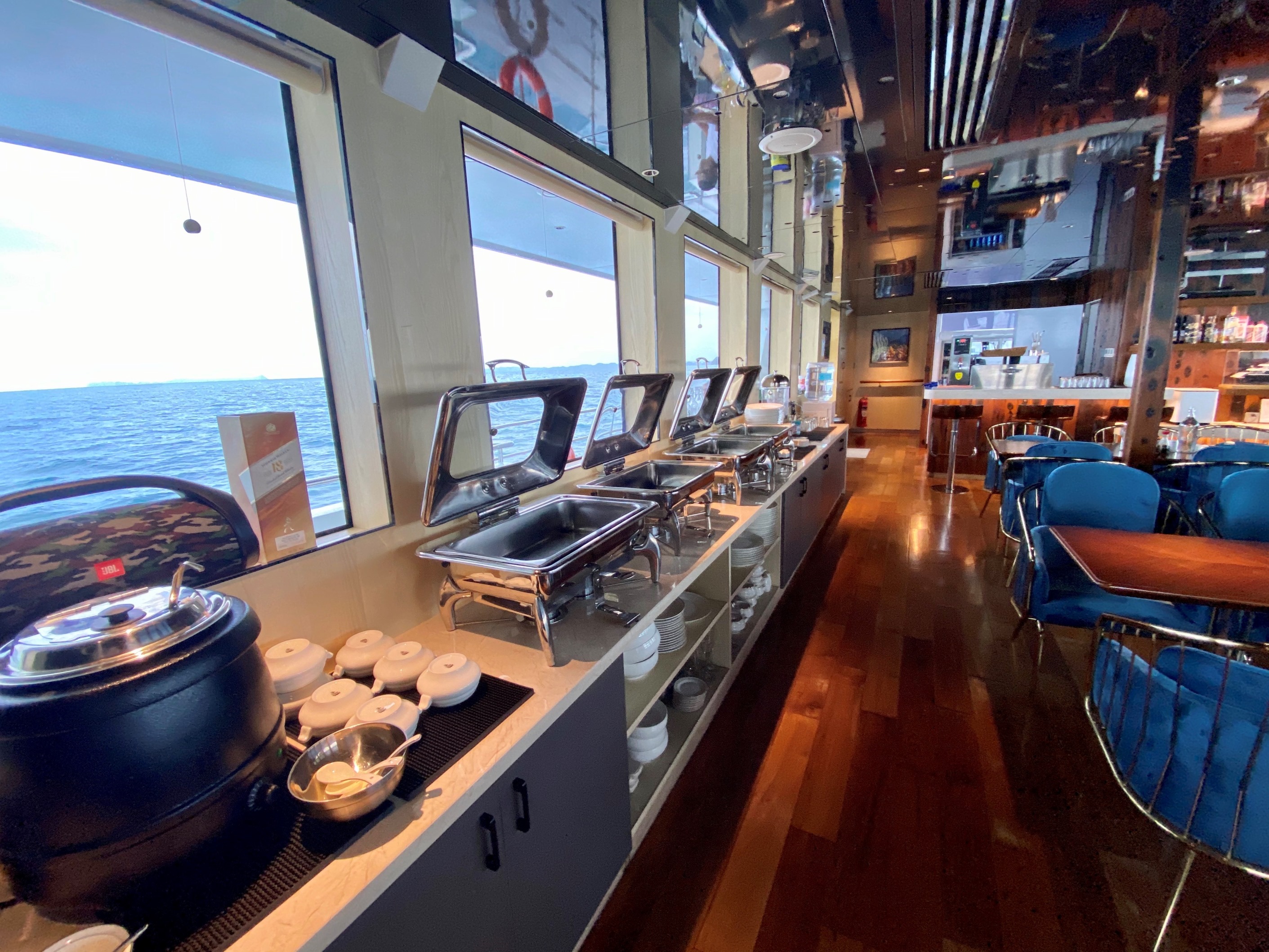 Aft of amidships is the spacious buffet dining room, with seating arranged along the starboard sidewall and as tables to seat up to eight people in the centre of the room.