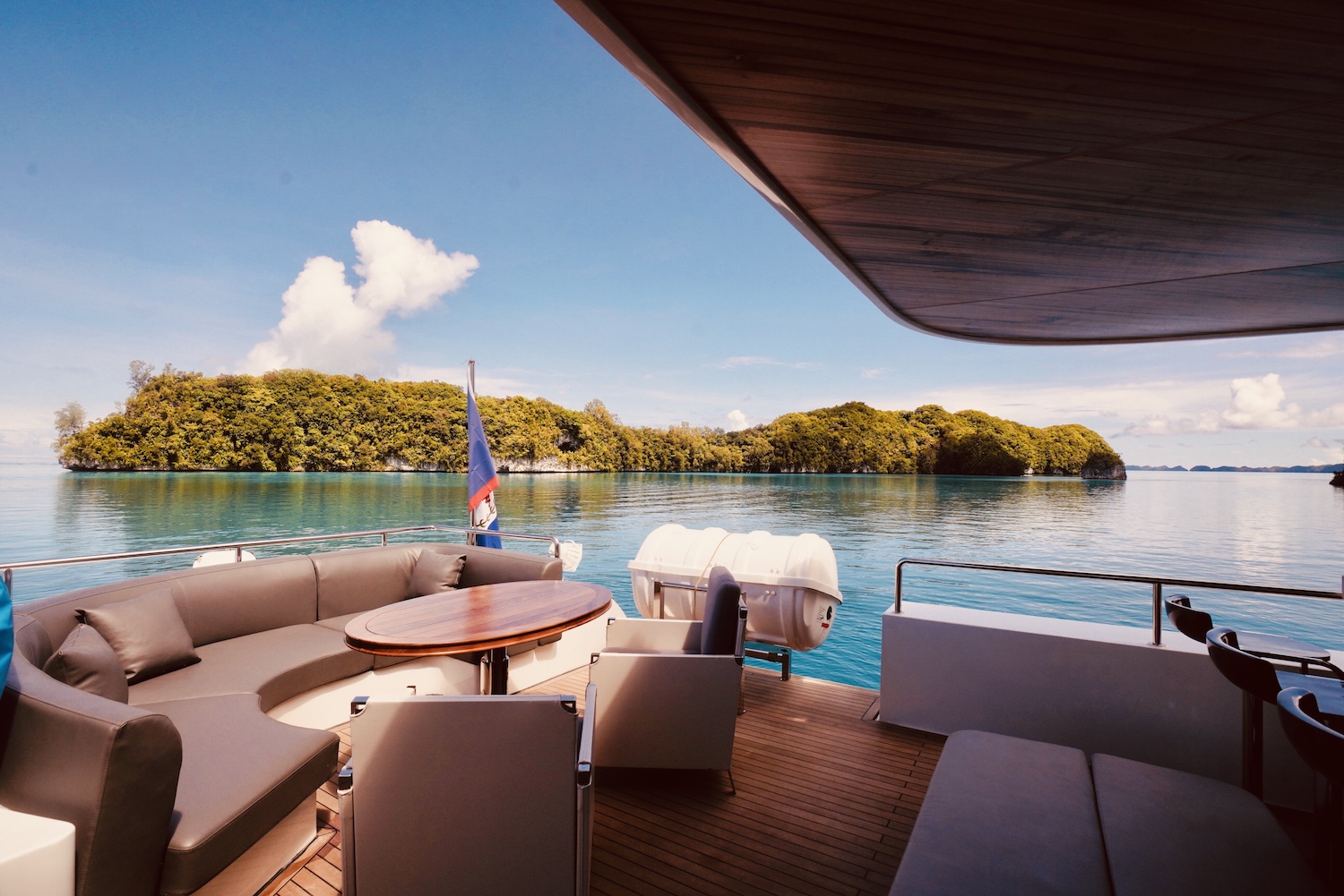 On the upper deck, there is a wet bar in the forward port corner and two curving sofas both with a coffee table and armchairs along the stern.