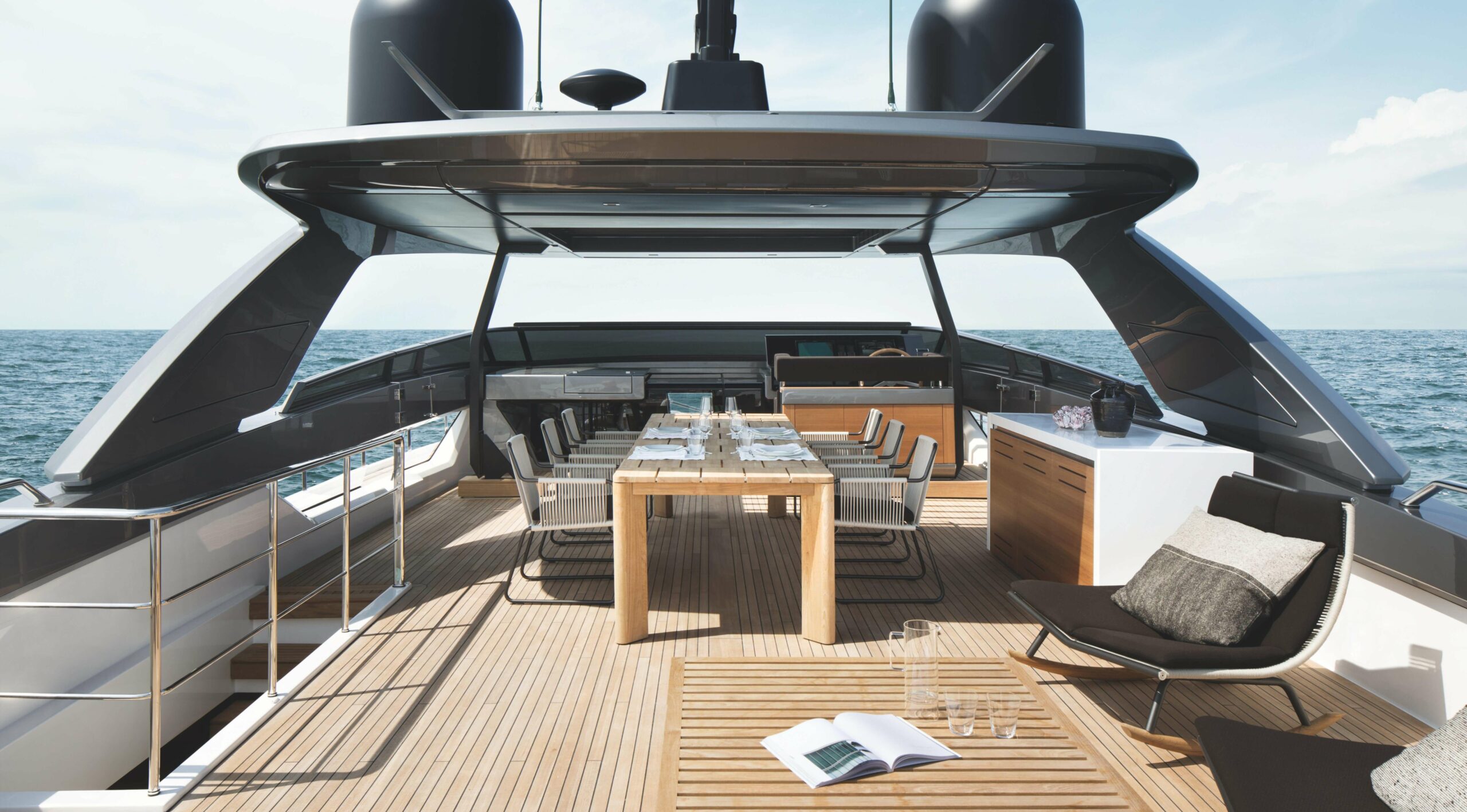Stairs on both sides of the stern connect to the swim platform below, and a port-side stairway also leads up to the flybridge. A side walkway to starboard connects to the foredeck, where a C-shaped sofa and drink table, plus sunbeds along the bow form sun drenched social area.