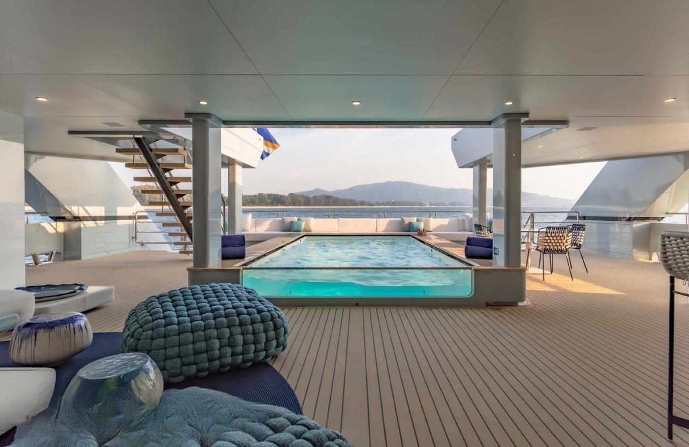 She has a large 575 square metre exterior space as well as 300 square metres of interior areas. Some of the main features of this innovative catamaran include the on deck pool or the large storage area.