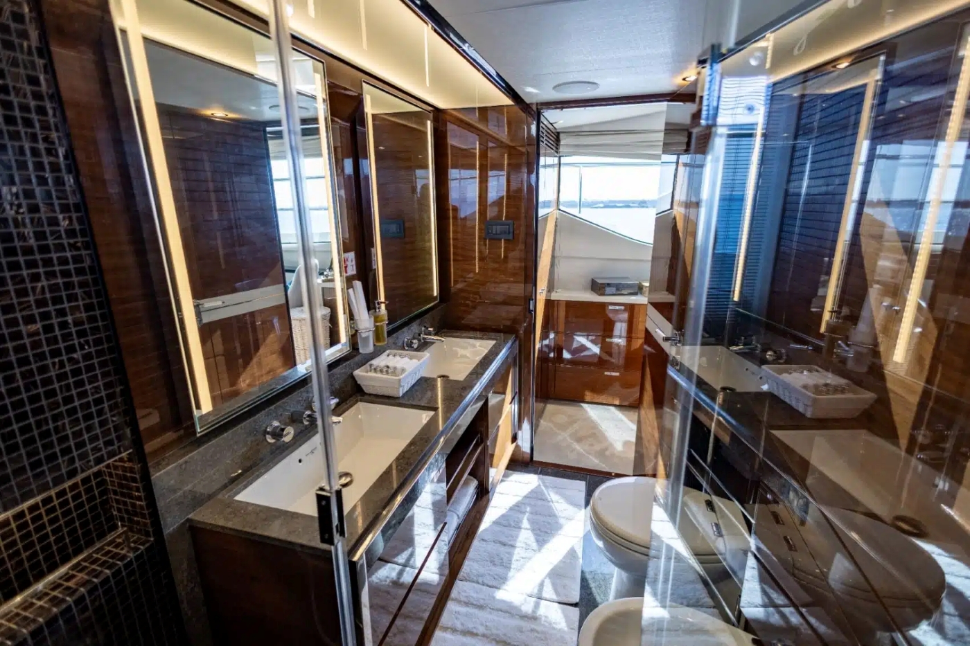Two armchairs and a side table are placed beneath the starboard windows and there is a forward en-suite bathroom containing a wardrobe, two sinks, a toilet, bidet and a shower.