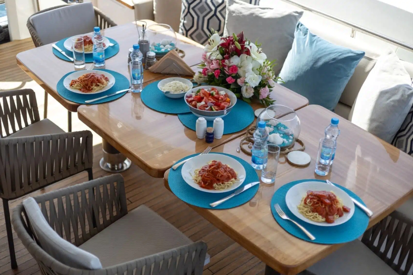 A pair of stairways lead up to the main deck aft, where a sofa lines the stern joined by movable chairs and three tables join together to form one large raised setting for alfresco dining or outdoor lounging with hobbies.