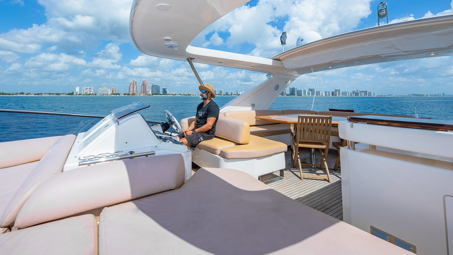 Flybridge yacht WICKED from Azimut is a fast and lightweight vessel ideal for short journeys between multiple close destinations. Her modern interiors combine warm wooden panelling with monochrome furnishings for a clean and elegant appearance.
