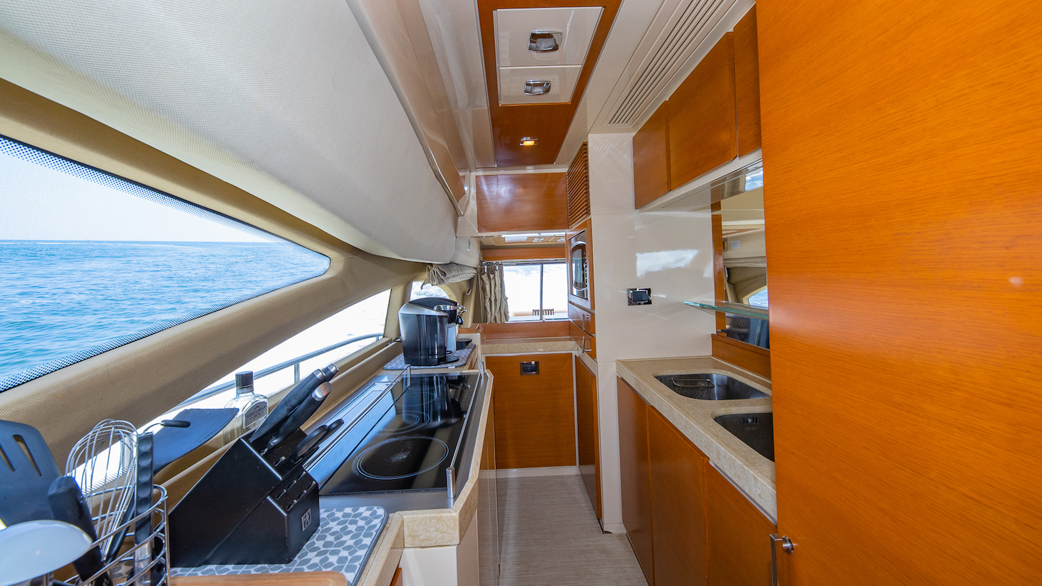Amidships, a C-shaped sofa and raised table is placed beneath the windows for plenty of sunlight and great views while dining or spending time on hobbies, and that starboard side is fitted with the galley.