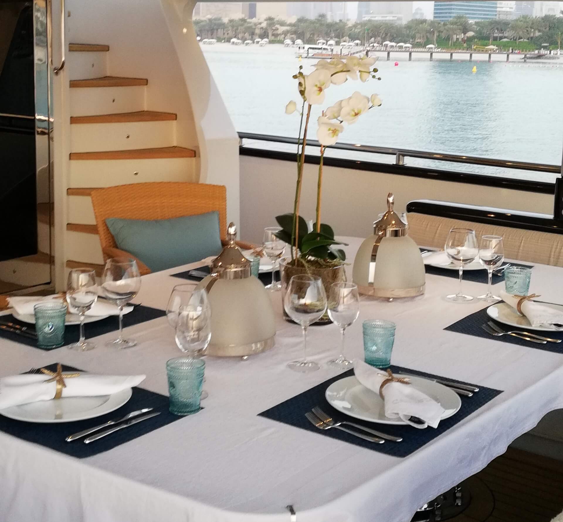 The aft main deck has a large dining area for 10 guests, and there is an aft swim platform for easy access into the water. The sun deck is fitted with a sunshade, barbecue, bar fridge, Spa Pool, private shower and sun beds.