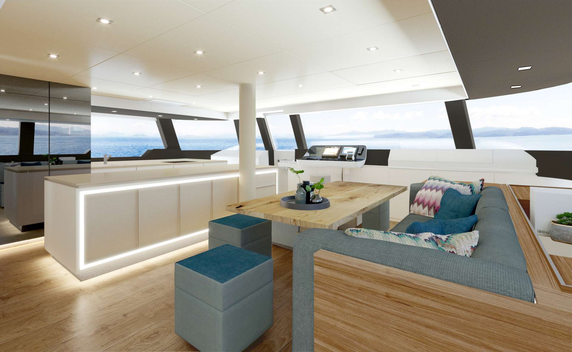 The main salon has huge panoramic windows offering spectacular views which can be enjoyed from the lounge furniture configured as a sofa, occasional chairs and foot stools.
