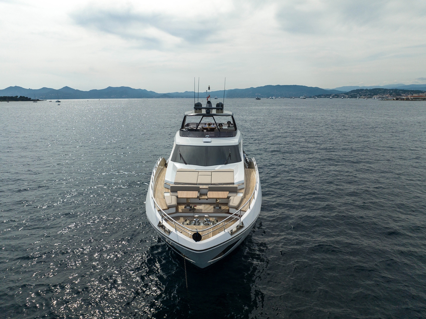 Two stairways lead down to the lower deck swim platform, and a port stairway connects to the fly bridge above. Side walkways lead up to the foredeck, where a broad sunbed and additional seating covers the area in front of the ...