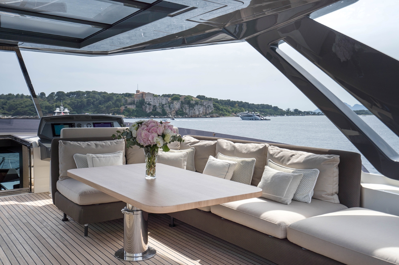 The main deck aft has a deep sofa-sunbed lining the stern along with a raised table and additional chairs for alfresco dining in comfort.
