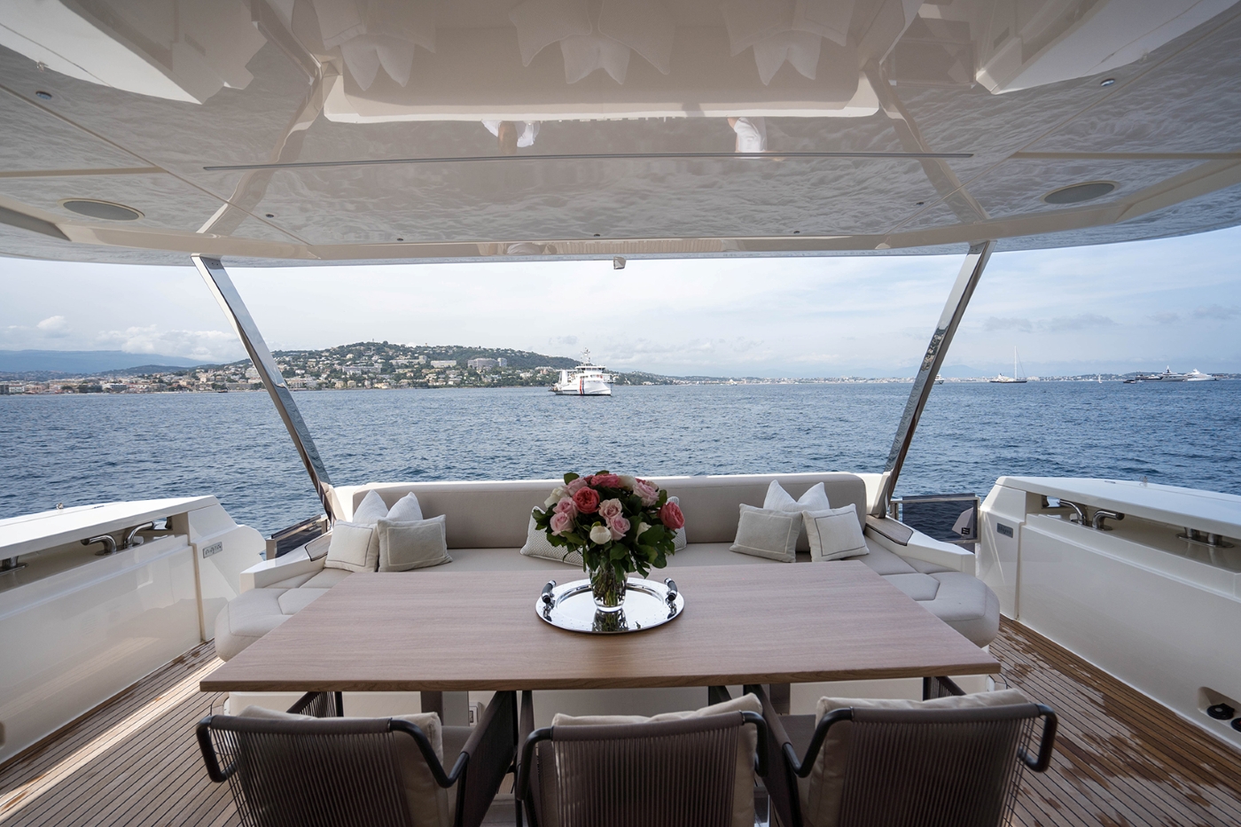 The main deck aft has a deep sofa-sunbed lining the stern along with a raised table and additional chairs for alfresco dining in comfort.