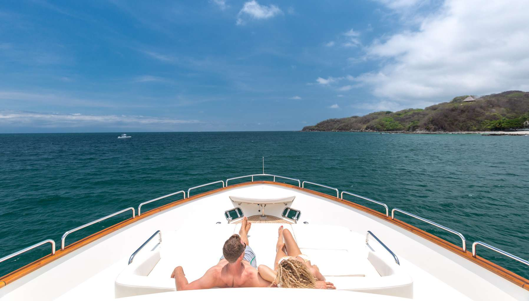 Side walkways provide access to the foredeck, where there is a tipple sunbed on the bow for guests to savour the sunshine and panoramic views.